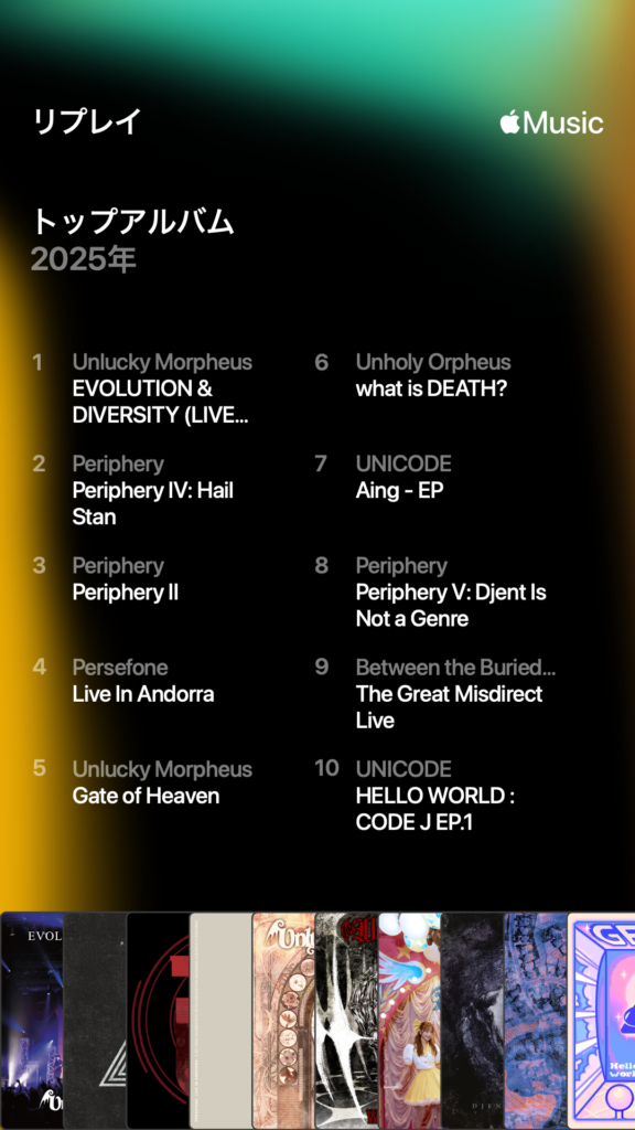 まあ、メタル(というか K-POP 以外)はアルバム単位で聴くことが多いので、時間的には伸びるのでしょうね。加えて、2025 年最初は韓国で航空機事故が発生して、年初しばらくカムバとか延期されていて、新しい曲が出てこなかったのですよね。そこで、「何かプログレメタルで聴いたことないアーティストで面白いのはないかな?」と探して見つけたのが Periphery でした。K-POP の動きがない間にこればかり聴いていたのが効いてます。