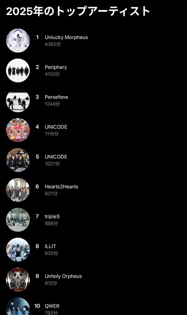 ここは予想通りメタル・プログレメタル系が上位に入ってきました。でも 4, 5 位がおそらく日本と韓国の UNICODE が別々にカウントされているので、これを足すと 3 位が UNICODE ですね。(共有画像にすると時間入らないのでスクショ画像です。というかトップアーティストは回数とかじゃなく時間でカウントされるのね)