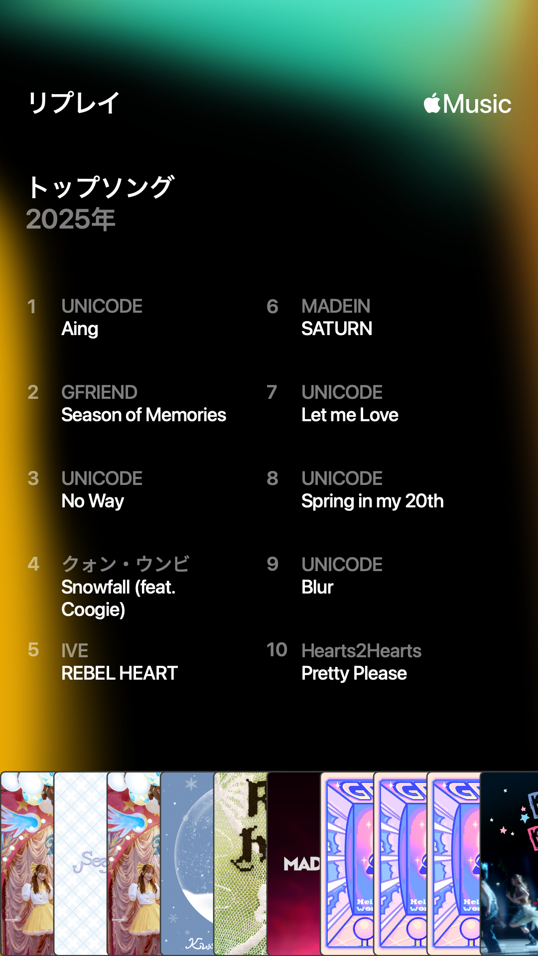Apple Music の Replay ’25 です。普段、Apple Music で音楽を聴くので、Apple Music で今年聞いた曲などの統計を教えてくれます(年じゃなくても月単位でも教えてくれるけど)。