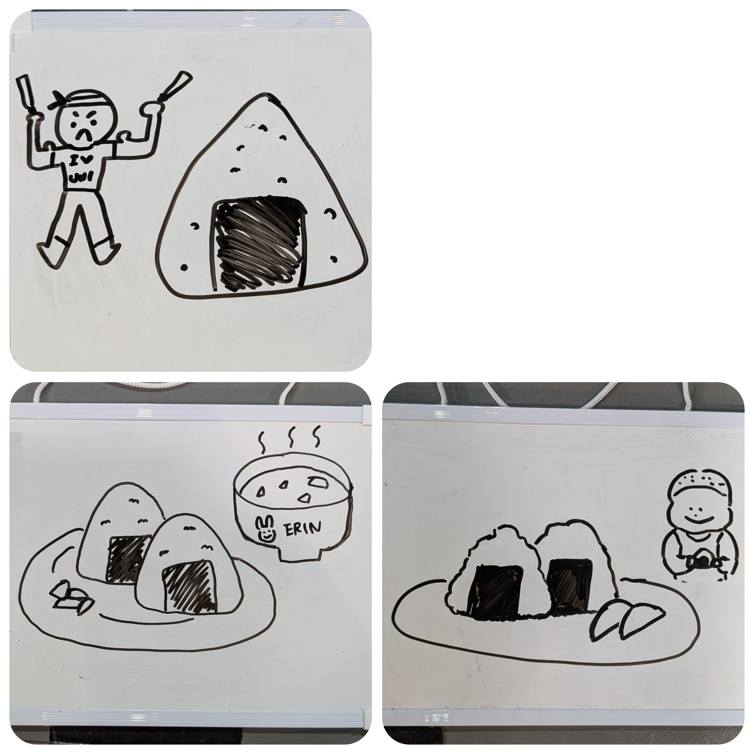 ゲームはお絵かきゲーム。引いたくじにお題が書かれていて、それをホワイトボードに書いていました。なんか焼き物系が多くてたこ焼き、お好み焼き、サムギョプサル… 最後のお題「おにぎり」はメンバーはけた後作品を置いといてくれて撮影可能でしたw みんなかわいく上手に書いてましたよ。